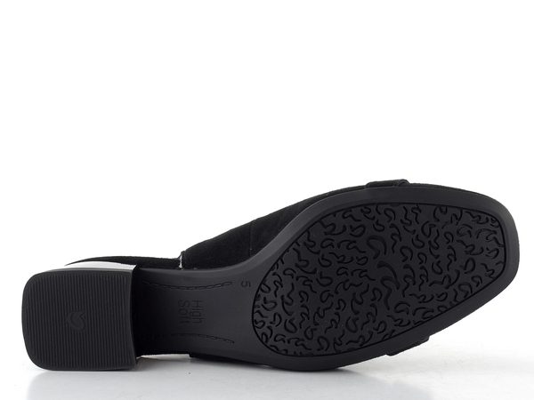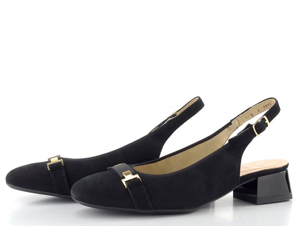 Elegantní širší dámské lodičky s volnou patou v klasickém černém provedení s kovovými komponenty ve zlaté barvě.