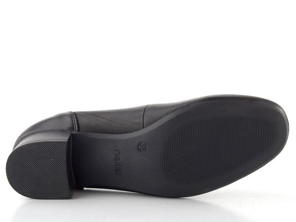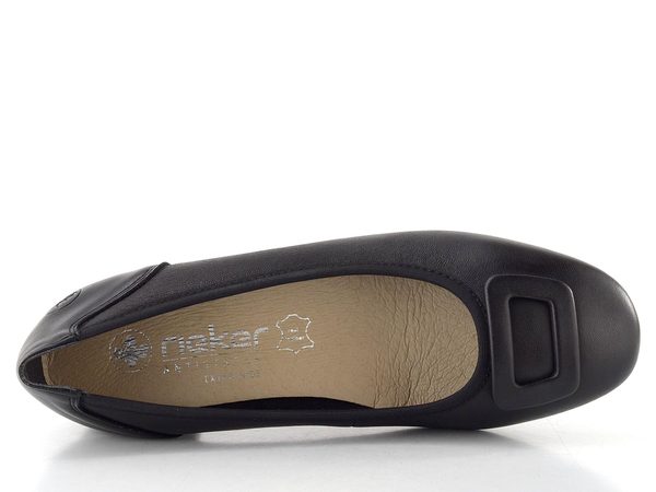Širší dámské lodičky z hladké kůže v černé barvě, s ozdobnou sponou na špičce a nízkým podpatkem.